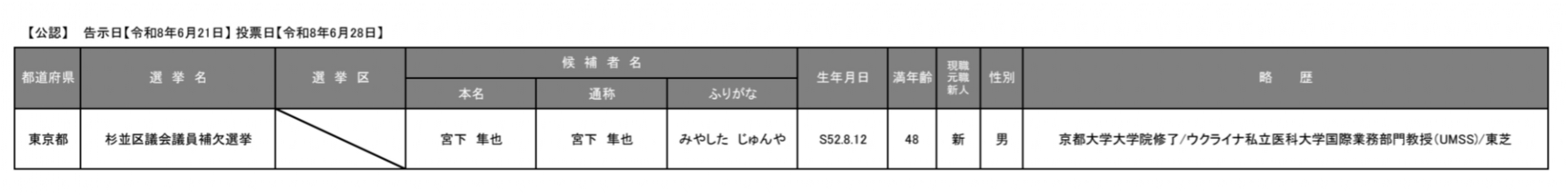 令和8年執行予定 東京都杉並区議会議員補欠選挙 公認候補予定者について 2026.04.11 令和8年執行予定 東京都杉並区議会議員補欠選挙 公認候補予定者が発表されましたのでお知らせいたします。 https://o-ishin.jp/news/2026/04/10/18280.html