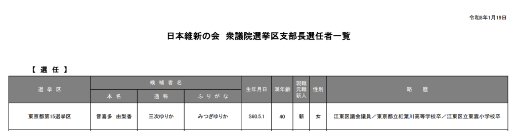 衆議院選挙区支部長選任のお知らせ(2026.1.19追加) 2026.01.19 衆議院東京都選挙区の支部長選任者が発表されましたのでお知らせいたします。 https://o-ishin.jp/news/2026/01/19/17891.html